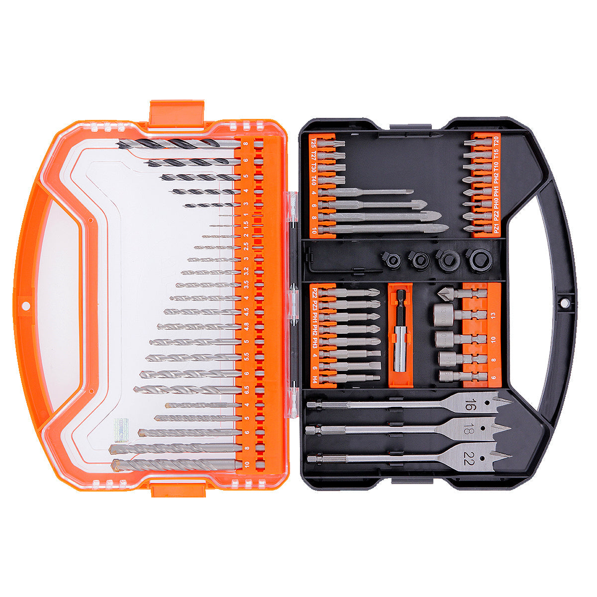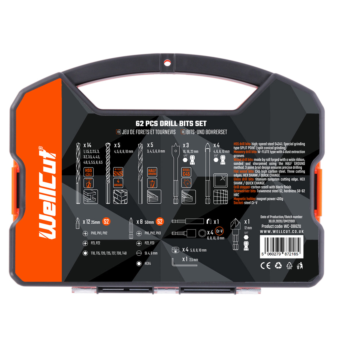 Wellcut Screwdriver and Drill Bit Set 62 Pieces HSS Metal Wood Masonry Concrete