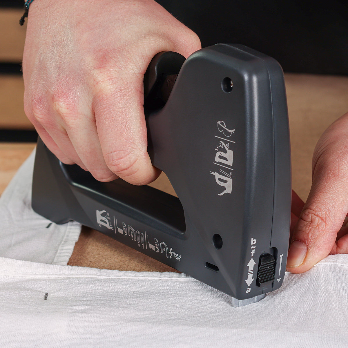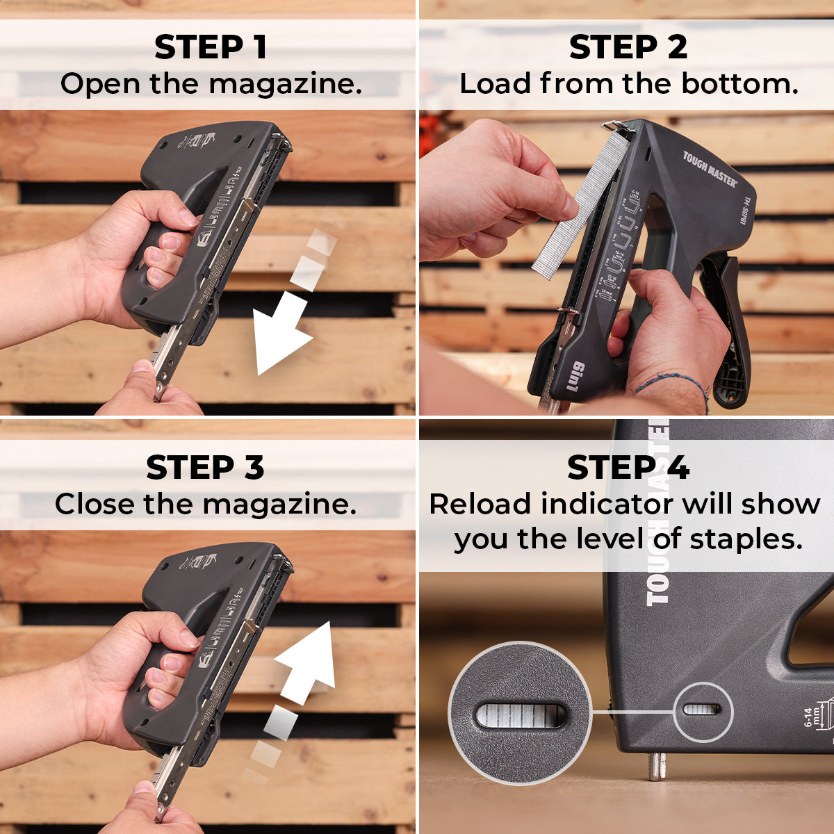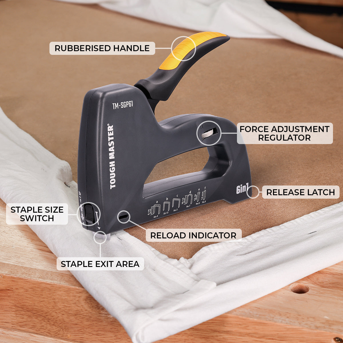 Su TOUGH MASTER 6 in 1 kabių pistoletu atlikite dar platesnį užduočių ir funkcijų spektrą. Šis susegiklis gali būti naudojamas su 6 tipų kabėmis, vinimis ir smeigtukais be galvučių: #3 kabės (6-14 mm) #4 kabės (6-14 mm) TR-13 kabės (6-14 mm) #7 kabės (10–14 mm) Kabės Nr. 8 (12–16 mm) ir kaiščiai Nr. 9 be dangtelių (14 mm). Pagaminta iš aukštos kokybės ABS plastiko, šis kompaktiškas ir patvarus segiklis yra lengvas, atsparus smūgiams ir paprastas naudoti. Pakeiskite kabės slėgį jėgos reguliatoriumi, kad jis atitiktų jūsų „pasidaryk pats“ projektus arba profesinius reikalavimus. Greitojo įkrovimo funkcija leidžia lengvai papildyti segiklį, o įkrovimo indikatorius rodo, kada reikia papildyti. Įsitikinkite, kad naudojate susegiklio rankenos užraktą „6 in 1“.